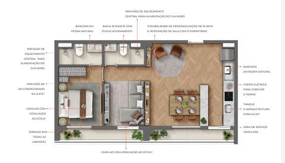 Plantas inteligentes de 2 dormitório 75m² com suite com e varanda - ideal para morar com estilo ou investir com segurança.