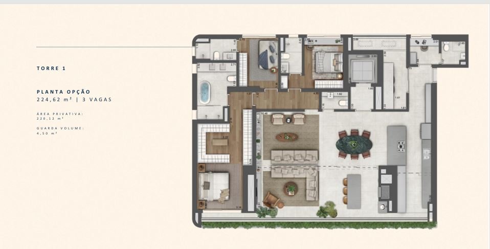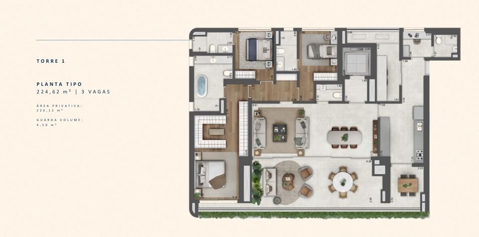 Unidades tipo de 3 suítes: 224,62 m² (220,12 m² privativos) - 3 vagas.