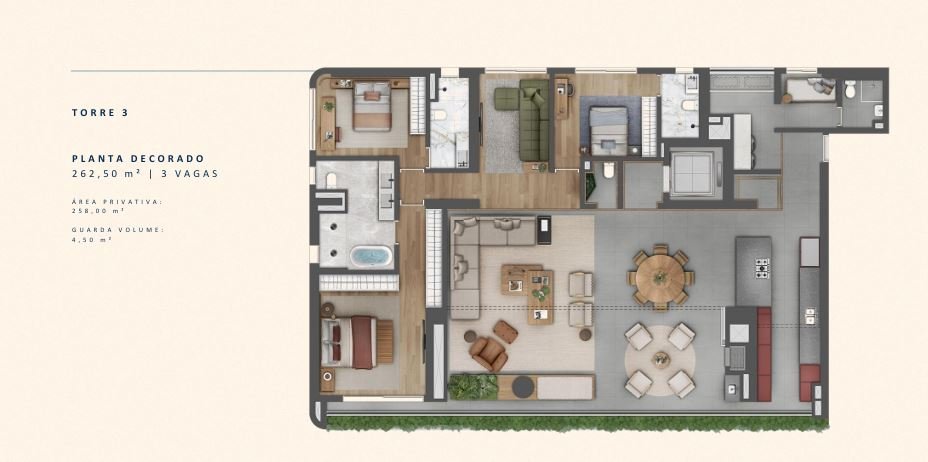 Unidades tipo de 3 suítes: 262,50 m² (258,00 m² privativos) - 3 vagas.