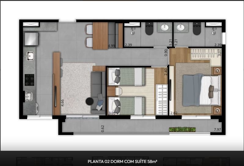 - Área Privativa: 58 m²